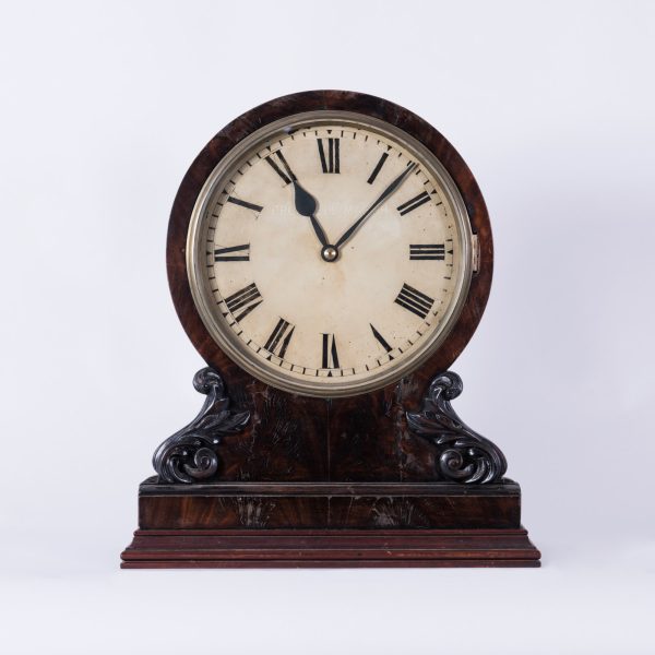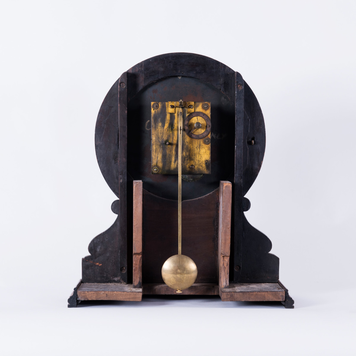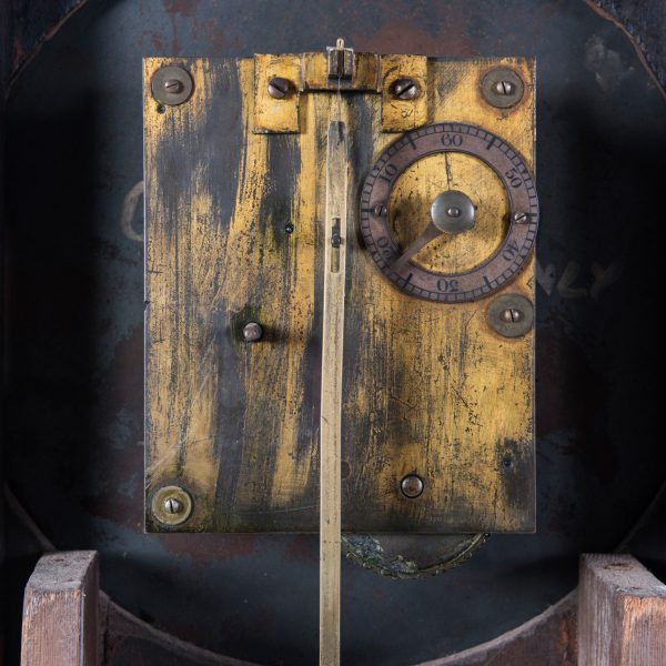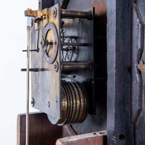 With an eight day movement, although the dial is indistinctly Marked ‘Cromwell Marsh’ this is probably the name of the retailer or the location from where the clock once was. The winding is from the rear and the clock was probably above a shop fitment or window display where it could be would from the rear.