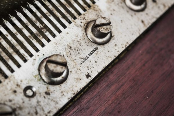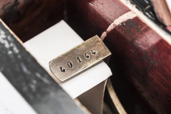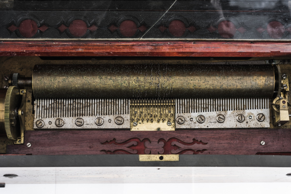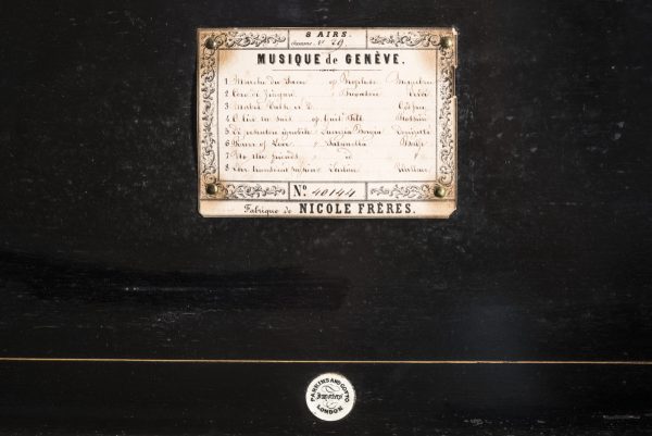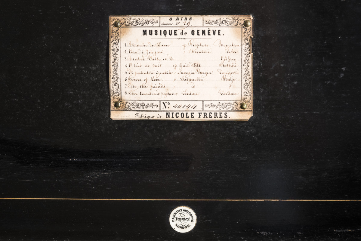 The box bears the serial number 40144 marked on the original tune sheet and the winding handle. It has ‘Nichole Freres’ stamped into both of the ‘combs’ that sit either side of the 17 individually marked organ stops.